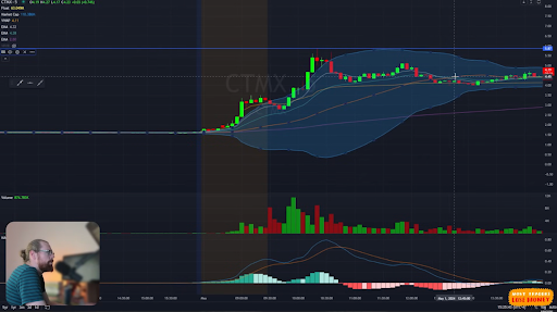 CTMX was up about 200% on the news. We saw a strong move, a small pullback, and then another push higher. Then came the topping tail candle — fully outside the upper band. The volume was high, the MACD was curling, and we were way above the 9 EMA.